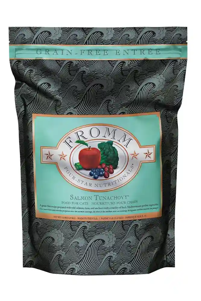 Fromm Four-Star Salmon Tunachovy® Recipe is an enticing, grain-free entrée with salmon, fish broth, tuna, and anchovy. This recipe is specially prepared to ensure consistency, quality, and superior taste in each and every bowl. Salmon Tunachovy® Recipe provides complete and balanced nutrition for cats of all ages and can be alternated with other Fromm Four-Star recipes.