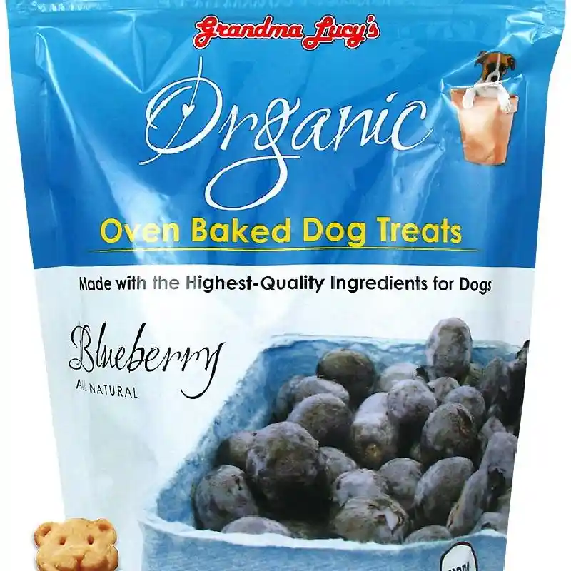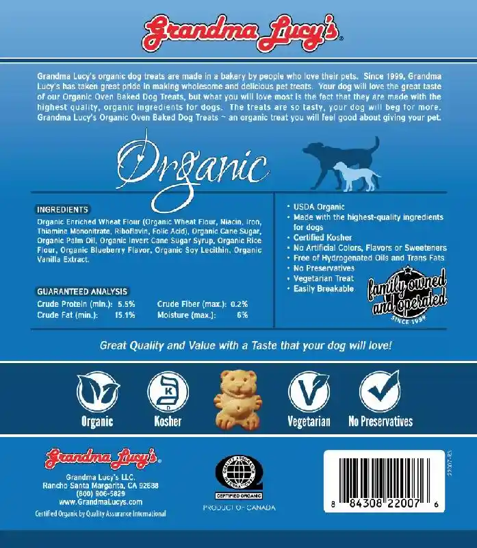 Grandma Lucy's Organic dog treats are made with 100% organic, human food grade ingredients. These vegetarian treats are oven baked, have no artificial flavors or colors, and are certified Kosher.