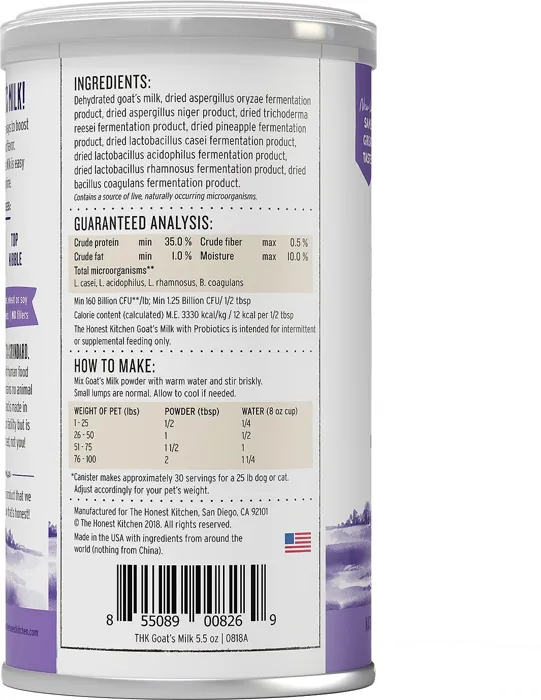 Goat's Milk is immune and digestive support for pro ball-fetchers and yarn-swatters. Its our own all-natural goats milk formula with a whopping 5 billion active probiotics and digestive enzymes, so its good for your pet and their gut. Daily Boosters can be poured onto kibble, used to hydrate The Honest Kitchen food, or served on its own as a deliciously nutritious drink that doesn't come with any nasty pesticides or growth hormones. Perfect as a bedtime beverage!