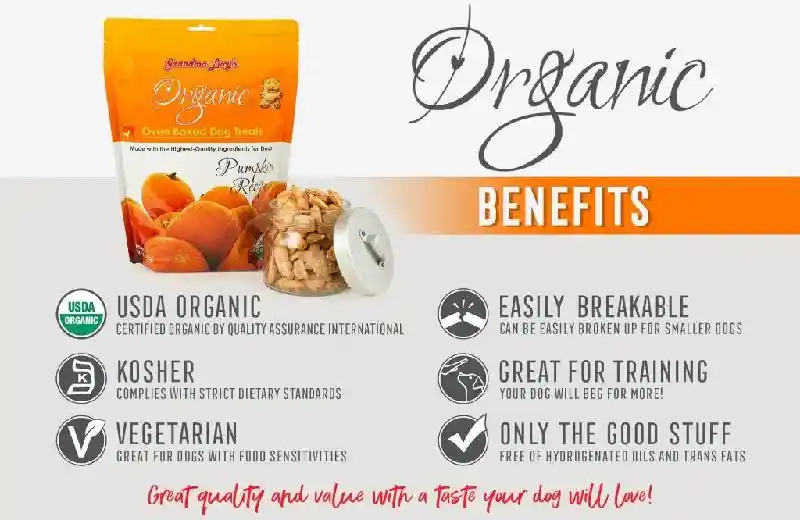 Grandma Lucy's Organic dog treats are made with 100% organic, human food grade ingredients. These vegetarian treats are oven baked, have no artificial flavors or colors, and are certified Kosher.